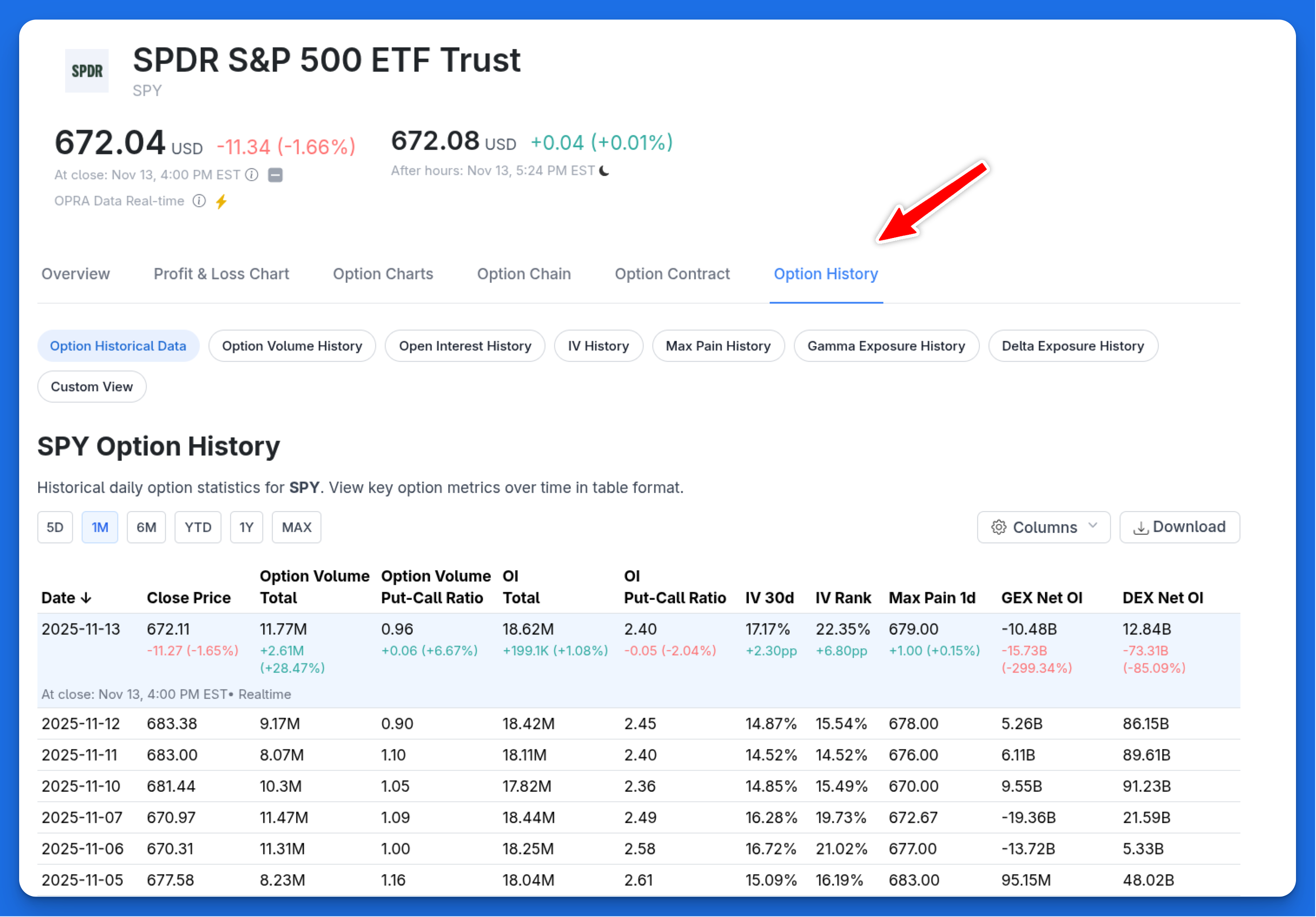 - Option Historical Data Table - View all available option history metrics in a sortable table
